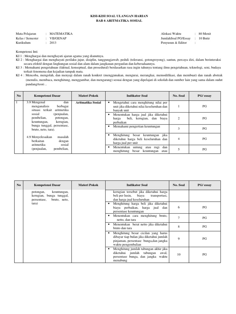 Jika dalam kurikulum 2006 materi aritmatika sosial diberikan pada kelas 7 smpmts pada semester 1 namun berdasarkan kurikulum 2013 edisi revisi 20162017 materi aritmatika sosial disampaikan pada kelas 7 smpmts di semester 2.